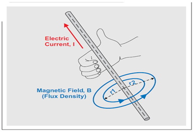 諸如電動(dòng)機(jī)的電源線(xiàn)等帶電導(dǎo)體,其周?chē)闶且粋€(gè)由流經(jīng)它的電流形成的磁場(chǎng)。應(yīng)用右手定則(請(qǐng)參見(jiàn)圖 1),我們很容易便可以確定該磁場(chǎng)的方向。該定則的內(nèi)容如下:用右手握住導(dǎo)體,然后拇指指向電流的方向,這時(shí)環(huán)繞導(dǎo)體的手指便指向磁場(chǎng)的方向。因此,磁通線(xiàn)的平面始終與電流垂直。