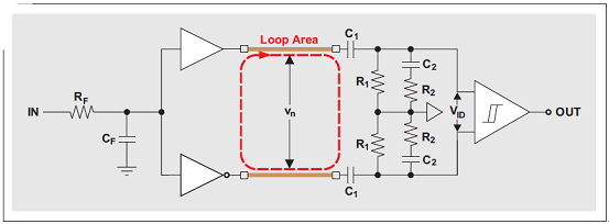 電容隔離器由兩塊硅芯片—一個(gè)發(fā)送器和一個(gè)接收機(jī)組成(請(qǐng)參見(jiàn)圖 2)。數(shù)據(jù)傳輸在由兩個(gè)電容構(gòu)成的差動(dòng)隔離層之間進(jìn)行,在每個(gè)電容的二氧化硅 (SiO2) 電介質(zhì)兩端都有一塊銅頂片和一個(gè)導(dǎo)電硅底片。發(fā)送器芯片的驅(qū)動(dòng)器輸出通過(guò)一些接合線(xiàn)連接到接收機(jī)芯片上隔離電容的頂片。通過(guò)將電容的底片連接接收機(jī)輸入構(gòu)成了一個(gè)導(dǎo)電環(huán)路。圖 3 顯示了隔離層的等效電路結(jié)構(gòu)圖,并標(biāo)示出了金接合線(xiàn)之間的環(huán)路區(qū)域。很明顯,穿過(guò)該環(huán)路的磁場(chǎng)將會(huì)產(chǎn)生一個(gè) EMF,其表示下面 RC 網(wǎng)絡(luò)的輸入電壓噪聲 Vn1。我們常常碰到的第二種差動(dòng)噪聲部分 Vn2,其產(chǎn)生原因是共模噪聲到差動(dòng)噪聲的轉(zhuǎn)換。兩個(gè)噪聲分量共同組成了綜合噪聲 Vn。如果只考慮 EMF 的影響,則可以保守地將 Vn 一分為二:
