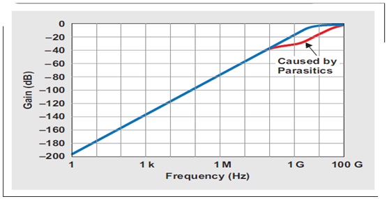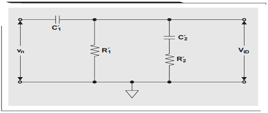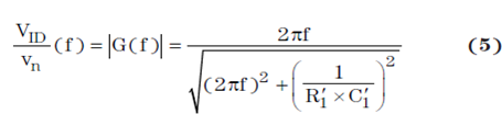 一次電路仿真證實(shí)了 RC 網(wǎng)絡(luò)為一個(gè)一階高通濾波器,其 C′1 和 R′1 為主要組件,頻率高達(dá) 100 MHz(參見(jiàn)圖 5 中藍(lán)色曲線(xiàn))。超出這一頻率以后,寄生組件 C′2 和R′2生效,從而引起稍稍偏離于線(xiàn)性的斜率。因此,頻率達(dá)到 100 MHz 以后,增益響應(yīng)可以表示為 VID/vn 的比: