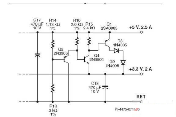 5V輸出端與3.3V輸出端的標(biāo)準(zhǔn)差異為1.7V。當(dāng)負(fù)載要求從3.3V輸出端獲得額外的電流,而從5V輸出端輸出的負(fù)載電流并未等量增加時(shí),其輸出電壓與3.3V輸出端的電壓相比將會升高。由于電壓差異約超過100 mV,Q5將偏置截止,從而導(dǎo)通Q4和Q1并允許電流從5V輸出端流到3.3V輸出端。該電流將降低5V輸出端的電壓,進(jìn)而縮小兩個(gè)輸出端之間的電壓差異。