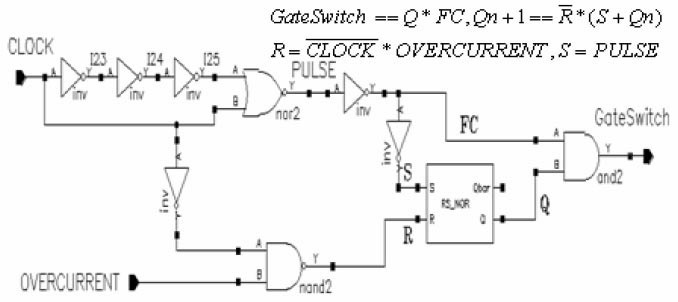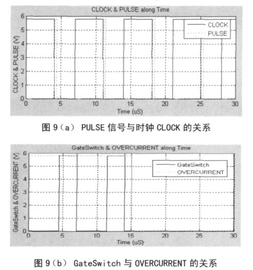 控制邏輯模塊如圖4 所示,該模塊直接控制LDMOS 的開關(guān)。PULSE 信號的上升沿對應(yīng)是CLOCK 時鐘的開始,PULSE 信號與時鐘CLOCK 的關(guān)系如圖9 所示。當(dāng)發(fā)生過流時,OVERCURRENT信號為低,觸發(fā)器R 端為高,Q 為低,GateSwitch 信號為低,關(guān)斷LDMOS,從而實現(xiàn)過流保護功能。