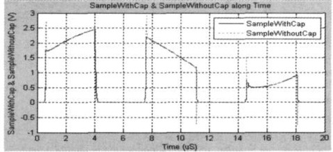 設(shè)檢測端電壓一般在10~50 V 之間變化,我們設(shè)置V(Detect)=SIN(30,20,50 k);周期為20μS;又設(shè)在采樣周期內(nèi),比較電壓為1 V;依據(jù)LDMOS管導(dǎo)通特性,設(shè)輸出漏電壓高于某值(本例為20伏)為過流,則分壓比設(shè)計為K = R4/ ( R3+R4)=5 k/(5 k+95 k)=1/20, 于是得到采樣電壓值為V(Sample)=V(Detect)*k =SIN(1.5,1,50 k),即最大值為2.5,最小值為0.5。同樣地,我們在采樣電路輸出端加上一個電容以消除電壓尖峰影響。該采樣電路仿真結(jié)果如圖6 所示。
