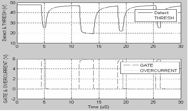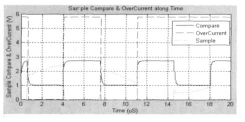 對圖3 進行電路仿真,電源電壓VCC 為5.8 V,LDMOS 漏端檢測電壓在10~50 V 之間,柵端電壓脈沖頻率為132 kHz,占空比為60%的方波,SPICE仿真條件設(shè)置為VCC=5.8 V,V (Detect)= SIN(30,20,50k),V (Gate)=PULSE(0,5.8,0.5u,0.5u,0.5u,3u,7u),仿真結(jié)果如圖8 所示。在1.26 uS~4.17 uS 和8.25 uS~11.2 uS 這兩個采樣區(qū)間內(nèi),采樣電壓V(Sample)較比較電壓V(Compare)大,輸出為低電平(過流保護,低電平有效);在15.2 uS~18.2 uS 采樣區(qū)間內(nèi),采樣電壓V (Sample) 較比較電壓V(Compare)小,輸出為高電平,對應(yīng)不發(fā)生過流情況;其他時間段內(nèi)柵電壓處于低電平,對應(yīng)LDMOS處于關(guān)斷態(tài),不可能發(fā)生過流,故過流輸出信號OverCurrent 為高電平。仿真結(jié)果表明,該電路確實能很好地實現(xiàn)過流保護的功能。