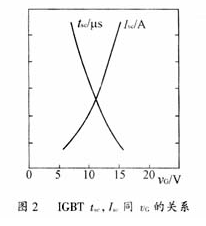 IGBT的短路電流和柵壓有密切關(guān)系,柵壓越高,短路時(shí)電流就越大。在短路或瞬態(tài)過(guò)流情況下若能在瞬間將vGS分步減少或斜坡減少,這樣短路電流便會(huì)減小下來(lái),當(dāng)IGBT關(guān)斷時(shí),di/dt也減小。集成驅(qū)動(dòng)電路如EXB841或M579xx系列都有檢測(cè)vCES電路,當(dāng)發(fā)現(xiàn)欠飽和時(shí),柵壓箝位到10V左右,增大vCES,限制過(guò)電流幅值,延長(zhǎng)允許過(guò)流時(shí)間。短路允許時(shí)間tsc和短路電流Isc同柵極電壓vG的關(guān)系如圖2所示。