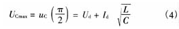 假設(shè)逆變關(guān)斷時(shí)濾波電感中的電流全部從電容C中流過(guò),同時(shí)整流器繼續(xù)輸出電壓Ud。圖6給出了等效電路,L與C串聯(lián)諧振,由于整流橋電流只能單向流通,所以振蕩到T/4時(shí)結(jié)束。