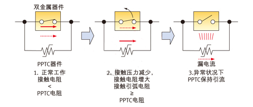 在正常狀態(tài)下,由于雙金屬片的電阻低,電流通過(guò)雙金屬片流過(guò)。在異常情況下,比如電動(dòng)工具轉(zhuǎn)子堵轉(zhuǎn)時(shí),電路中將產(chǎn)生很高的電流,導(dǎo)致雙金屬觸點(diǎn)打開(kāi),其接觸電阻增加。此時(shí)電流將通過(guò)低電阻的PPTC流過(guò)。流過(guò)PPTC的電流,不僅抑制了觸點(diǎn)之間電弧的產(chǎn)生,同時(shí)又加熱雙金屬片,使其保持在打開(kāi)狀態(tài)和鎖定位置。