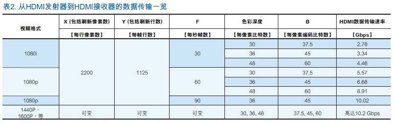 表1顯示了每種分辨率和相應(yīng)的每行像素和每幀行數(shù)。對於表1列出的每一個色深,都有一個相應(yīng)的為每個像素顏色而傳輸?shù)木幋a比特數(shù)。需要從HDMI發(fā)射器發(fā)送至HDMI接收器的數(shù)據(jù)量可以被解釋為這些變量之間的關(guān)係,包括更新屏幕所需的幀數(shù)。表2描述了這種關(guān)係: