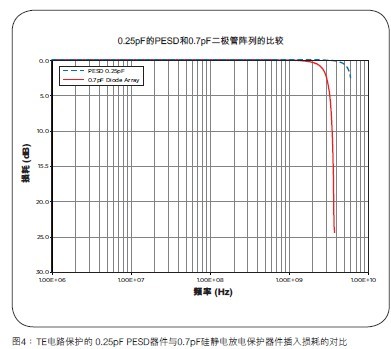 圖4對TE電路保護(hù)的PESD器件和普通的0.7pF硅靜電放電保護(hù)解決方案進(jìn)行了對比。TE電路保護(hù)的PESD器件的插入損耗可以忽略不計,即使是在HDMI1.3規(guī)范規(guī)定的最高速度3.4GHz運(yùn)行時。普通的0.7pF硅靜電放電保護(hù)器件通常表現(xiàn)出其插入損耗隨頻率增加急劇增加的特點,當(dāng)HDMI以1080p 36位色彩深度的2.25GHz速度運(yùn)行時,給TMDS信號引入的插入損耗超過3dB。以更高的分辨率和顏色深度的3.4GHz全速運(yùn)行時,硅靜電放電保護(hù)器件可以造成超過6dB的信號衰減,有效地消減了一半以上的信號電平。