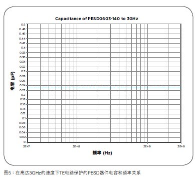 如圖5所示,TE電路保護(hù)的PESD器件在3GHz速度下具有穩(wěn)定的電容和頻率關(guān)係。其行為非常類似於一個0.25pF(典型值)的電容,從而可以大大簡化設(shè)計。由於HDMI的TMDS對根據(jù)數(shù)據(jù)模式,視頻源的分辨率和色彩深度改變運(yùn)行頻率,瞭解ESD保護(hù)器件的電容在很寬的頻率范圍內(nèi)是穩(wěn)定的特點可以為設(shè)計人員提供更多的自由度和靈活性。