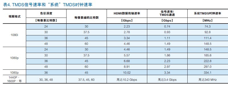 因而信號時鐘和數(shù)據(jù)傳輸率相當(dāng)於“系統(tǒng)”TMDS時鐘速率的十倍。此外,對於更高的色彩深度,信號時鐘速率會更高,以適應(yīng)傳輸更多每像素編碼比特數(shù)。表4中描述了鏈路數(shù)據(jù)速率、TMDS信號速率和“系統(tǒng)”TMDS時鐘速率之間的關(guān)係。