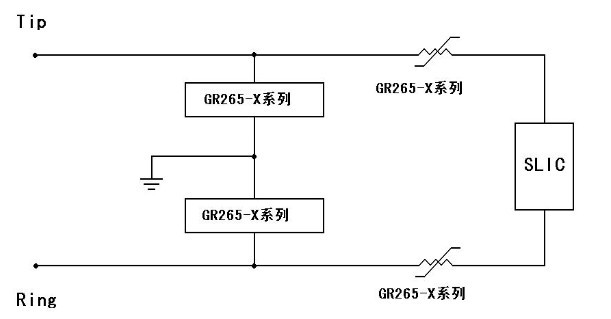 目前本公生產(chǎn)的GR265-X和GR600-X 等系列高分子PTC 熱敏電阻和半導體固體放電管一起用于總配線架的保安單元中,可以滿足過流和過壓保護的要求,同時幫助保安單元滿足中國通信行業(yè)標準 YD/T 694-1999-2002、北美 TelcordiaGR-974 及 ITU-T K.20 等標準,典型的使用電路如上圖所示。