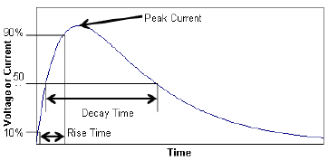 系統(tǒng)所經(jīng)歷的電氣應(yīng)力是各種各樣的: 有納秒上升時間且持續(xù)數(shù)以10計的安培電流的靜電放電(ESD)應(yīng)力;有微秒上升時間且持續(xù)數(shù)以萬計的安培電流的閃電應(yīng)力。對可以想到的現(xiàn)實世界中的每一種應(yīng)力都進(jìn)行產(chǎn)品測量是不可能的。所以標(biāo)準(zhǔn)機(jī)構(gòu)制定了針對每個特定的應(yīng)力威脅制定了專門的測試標(biāo)準(zhǔn)。這些標(biāo)準(zhǔn)以電壓和電流波形的形式來表示應(yīng)力。最常見的一種應(yīng)力波形就是圖示的雙指數(shù)波形。典型的電壓波型是被理解成開路,而典型的電流波型是被理解為短路。通常一個波形的參數(shù)包括峰值電壓、峰值電流、上升時間(通常是峰值時間的10%到90%)以及衰減時間(峰值時間的50%)。標(biāo)準(zhǔn)同樣規(guī)定了如何把應(yīng)力波形應(yīng)用到實際的被測試的設(shè)備以及通過或者未通過測試的準(zhǔn)則。這就確保了測試結(jié)果可以被任何一個做此種測試的人重現(xiàn)出來,并且通過這個測試的系統(tǒng)可以可靠地工作。