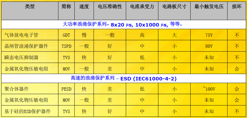 市場上有一系列對電子系統(tǒng)起保護(hù)作用的產(chǎn)品。下表簡單描述了各種產(chǎn)品的特征。