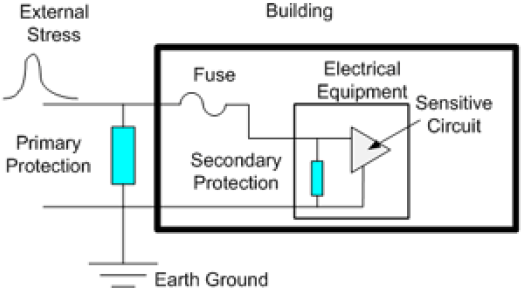 初級和次級保護(hù)的應(yīng)用非常普遍。這個概念在電信產(chǎn)業(yè)中用于閃電和浪涌保護(hù),也在先進(jìn)集成電路技術(shù)中做靜電放電(ESD)保護(hù)。初級的保護(hù)元件較貼近應(yīng)力源,主要目的是用于承受大部分的電流應(yīng)力,而次級保護(hù)元件則非常貼近敏感的電路元件,在最需要的地方提供保護(hù)。