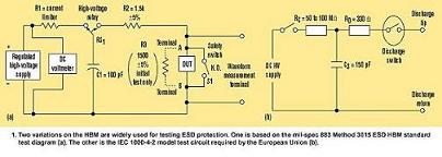 最流行的HBM變種是國際電工委員會(huì)IEC1000-4-2標(biāo)準(zhǔn),定義為150pF電容通過一個(gè)330Ω電阻放電(圖1b)。這是歐盟對在其區(qū)域內(nèi)商品銷售所必須的國際測試。
