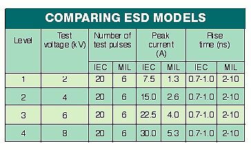但是,明顯的瞬間電壓威脅和能量等級的不同存在于兩個(gè)模型之中。于是設(shè)計(jì)工程師可以使測試過程適合他們所期望的具體應(yīng)用。例如,IEC1000-4-2具有一個(gè)非??焖俚碾娖矫}沖上升時(shí)間,能應(yīng)用更多的脈沖和更高的峰值電流(見表格)。