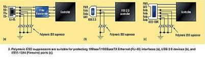 另外,商業(yè)化產(chǎn)品要求在所有不同的硬件接口位置都要有ESD浪涌保護(hù)。例如,一些新型電腦和更高端的消費(fèi)電子可能會(huì)如下這些互連器件的大部分或者全部:以太網(wǎng)、USB1.1/USB2.0、IEEE-1394/1394b、音頻/視頻/RF以及傳統(tǒng)的RS-232、RJ-11等端口等的audio/video/RF端口。所有傳統(tǒng)的保護(hù)器件都已經(jīng)不同程度地得以成功應(yīng)用。但是,如今不斷增長的工作頻率為超低電容器件(如聚合物抑制器)提出了需求(圖2a)?! ?br />