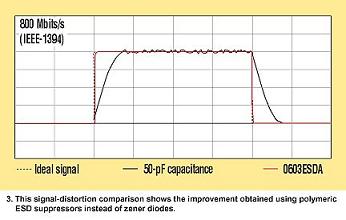 另外,許多新型消費(fèi)電子器件能執(zhí)行快速的IEEE-1394/1394b(Fireware)數(shù)據(jù)轉(zhuǎn)換協(xié)議。這種非常高的數(shù)據(jù)速率(1600 Mbps,1394b)要求低電容ESD抑制器,例如聚合物浪涌器件(圖 2c)。測試數(shù)據(jù)表明,聚合物ESD抑制器帶來的信號失真比硅二極管器件保護(hù)Firewire端口產(chǎn)生的更少(圖 3)。