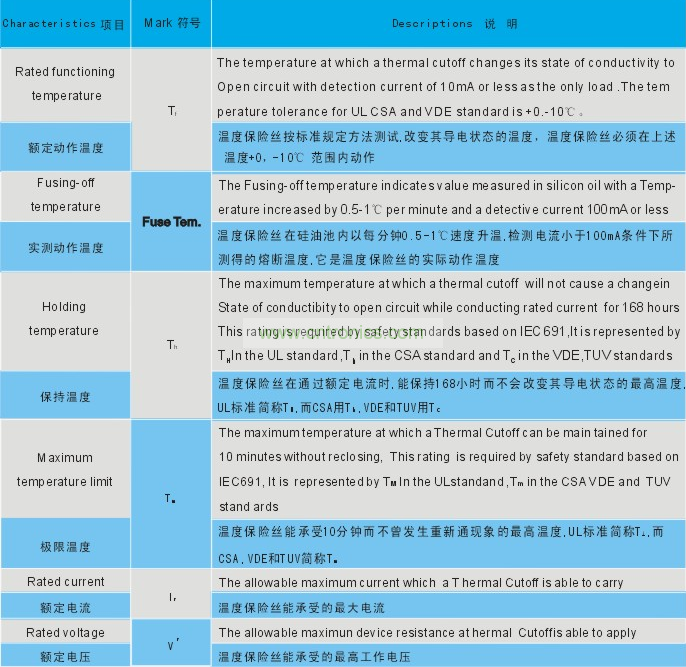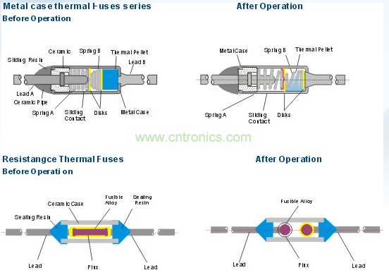 當(dāng)溫度保險絲周圍溫度上升到它的動作溫度時,其易熔合金熔化并在表面張力作用下及特殊樹脂幫助作用下,收縮成球狀附兩引腳未端或保險絲內(nèi)彈簧的彈力推走電極作用,這樣電路被切斷