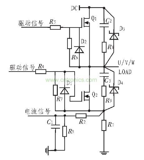 當(dāng)電流過大或者發(fā)生短路時(shí),功率MOSFET漏極與源極之間的電流會(huì)迅速增加并超過額定值,必須在過流極限值所規(guī)定的時(shí)間內(nèi)關(guān)斷功率MOSFET,否則器件將被燒壞,因此在主回路增加電流采樣保護(hù)電路,當(dāng)電流到達(dá)一定值,通過保護(hù)電路關(guān)閉驅(qū)動(dòng)電路來保護(hù)MOSFET管。圖1是MOSFET管的保護(hù)電路,由此可以清楚的看出保護(hù)電路的功能。