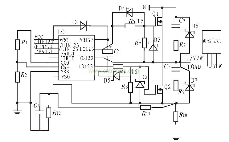 圖2中HIN1~HIN3、LIN1~LIN3:逆變器上橋臂和下橋臂功率管的驅(qū)動(dòng)信號(hào)輸入端,低電平有效。CA-、CAO、VSO:內(nèi)部放大器的反相端、輸出端和同相端,可對(duì)主電路的電流進(jìn)行檢測(cè)。ITRIP:過流信號(hào)檢測(cè)輸入端,可通過輸入電流信號(hào)來完成過流或直通保護(hù)。FAULT:過流、直通短路、過壓、欠壓保護(hù)輸出端,該端提供一個(gè)故障保護(hù)的指示信號(hào)。它在芯片內(nèi)部是漏極開路輸出端,低電平有效。VB1~VB3:是懸浮電源連接端,通過自舉電容和快速恢復(fù)二極管為3個(gè)上橋臂功率管的驅(qū)動(dòng)器提供內(nèi)部懸浮電源,其中快速恢復(fù)二極管的作用是防止母線電壓倒流損壞器件,VS1~VS3是其對(duì)應(yīng)的懸浮電源地端。HO1~HO3、LO1~LO3:逆變器上下橋臂功率開關(guān)器件驅(qū)動(dòng)器信號(hào)輸出端?! ?br />