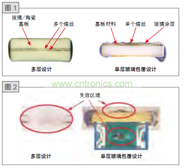 圖1比較了SFF保險絲的多層設(shè)計與標(biāo)準(zhǔn)玻璃包覆設(shè)計。當(dāng)熔絲斷開時,玻璃包覆設(shè)計僅依靠熔絲一側(cè)上的涂層吸收汽化熔絲材