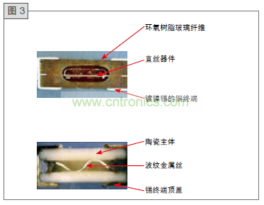 圖3為直絲設(shè)計的2410SFV保險絲和一般波紋絲設(shè)計的對比。直絲器件在空氣中熔斷性能更一致,具有更低電阻和良好的浪涌抵
