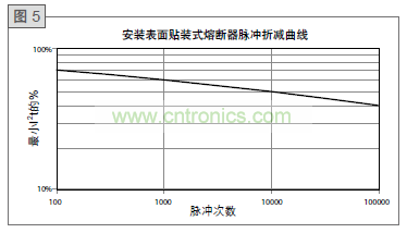 一旦確定了應(yīng)用波形的I2t值,它必須根據(jù)系統(tǒng)壽命中的預(yù)期循環(huán)次數(shù)折減。由于電流脈沖導(dǎo)致的應(yīng)力本質(zhì)上是機(jī)械作用力,受力次數(shù)對保險絲折減程度具有重要影響。圖5給出了TE Connectivity表面貼裝式保險絲在十萬次循環(huán)內(nèi)的電流脈沖折減曲線。