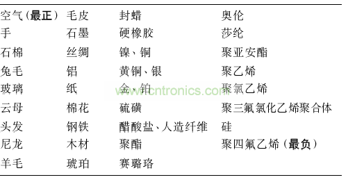 表1列出了不同材料摩擦起電的電荷特性,如玻璃、尼龍帶t1:電,硅、聚四氟乙烯帶負電。材料的導(dǎo)電性也對材料表面建立電荷的能力有影響,許多材料的導(dǎo)電性或表面電阻很大程度上取決于濕度,濕度越低導(dǎo)電能力越低,越容易阻止電荷的遷移使其停