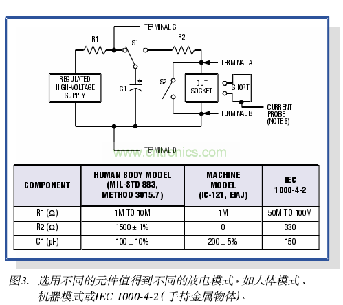 第二種方法是IEC 1000-4-2 >現(xiàn)已成為國際標準。相比Method 3015.7測試條件,它規(guī)定了更高的電容和更低的電阻}IE C 1000-4-2被廣泛地)II于測試終端設(shè)備的接口(表2)。值得一提的是> Maxim公司的模擬開關(guān)和RS-232/RS-485接口IC完個符合這些ESD標準,且無須外圍兒件。
