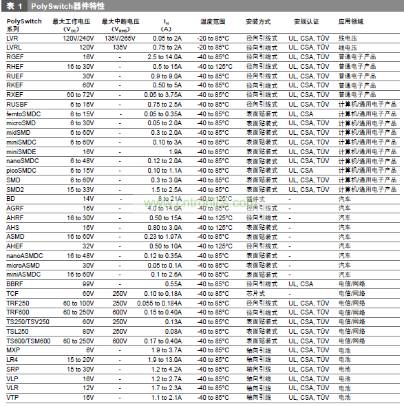 確保應(yīng)用場合的最小和最大環(huán)境溫度在PolySwitch器件的操作溫度范圍內(nèi)。大多數(shù)PolySwitch器件的操作溫度范圍介于-40℃到85℃,某些特殊情況下會達到125℃。
