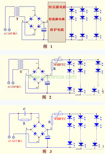 如果用WHPTC過流保護(hù)器作保護(hù),將是另外一種結(jié)果,從原理可知,當(dāng)電路的電流超過規(guī)定值時(shí)會(huì)訊速的自動(dòng)保護(hù),在排除故障后又自動(dòng)復(fù)位,無(wú)需人工更換。對(duì)LED而言,電壓的變化不是LED損壞的直接原因,而電流的增大才是LED的真正殺手。顯而易見,利用WHPTC的這個(gè)特性,在LED的電路保護(hù)上具有絕對(duì)的優(yōu)勢(shì),讓簡(jiǎn)易電源供電變?yōu)楝F(xiàn)實(shí)。實(shí)踐證明,在LED電路出現(xiàn)故障以前就有效保護(hù)了。在簡(jiǎn)易電源上,這個(gè)優(yōu)勢(shì)特別突出。對(duì)如下3圖分析可見,因有了WHPTC后可省去恒流、恒壓電路, LED的質(zhì)量也提高了。器件成本、生產(chǎn)成本、故障率、服務(wù)成本等,都大大降低。也大大增加了產(chǎn)品的市場(chǎng)競(jìng)爭(zhēng)力。所以誰(shuí)先使用WHPTC,誰(shuí)先占領(lǐng)市場(chǎng)。