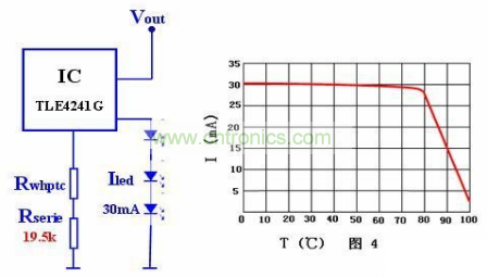 圖2所示電路2為另一常見的恒流源電路:電流通過連接驅(qū)動(dòng)IC的電阻得以確定。然而在這種情況下,調(diào)節(jié)電阻并未與LED串聯(lián)。Rset和ILED之間的比率由IC規(guī)格明確。因此,運(yùn)用20KΩ的串聯(lián)電阻和TLE4241G型驅(qū)動(dòng)IC,最終產(chǎn)生的LED電流為30mA。圖4所示為標(biāo)準(zhǔn)電路改良型,其中也含有一個(gè)PTC熱敏電阻,盡管此處采用WHPTC熱敏電阻。在感測(cè)溫度,元件電阻可達(dá)4.7KΩ,且容許誤差值為±5℃(標(biāo)準(zhǔn)系列)或±3℃(容許誤差值精確系列)。