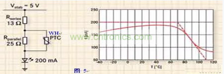 由于LED電流的絕大部分流經(jīng)PTC熱敏電阻本身,因此需要選擇一個(gè)較大的徑向引線式元件。PTC將因?yàn)榱鹘?jīng)電阻本身的電流而導(dǎo)致發(fā)熱,因此會(huì)一直減少電流,無(wú)論環(huán)境溫度為何(如圖5所示)。并聯(lián)兩個(gè)或更多片式PTC熱敏電阻會(huì)將電流分流,但此方案仍存在局限性。