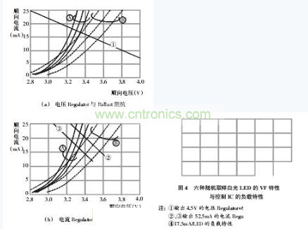 圖3是驅(qū)動(dòng)白光LED常用的四種電源電路;圖4是上述六種隨機(jī)取樣白光LED穩(wěn)定后的ReguLation精度特性。