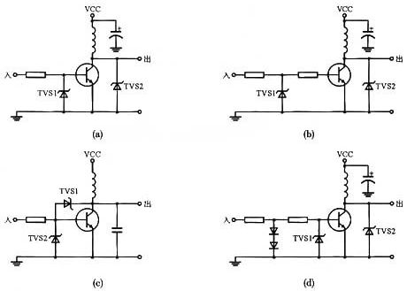 各種瞬變電壓能使晶體管的EB結(jié)或CE結(jié)擊穿而損壞,特別是晶體管集電極有感性(線圈、變壓器、電動機)負載時,通常會產(chǎn)生高壓反電勢,因而可能使晶體管損壞。在實際應(yīng)用中,建議采用TVS作為保護器件。圖3所示為TVS保護晶體管的四種電路實例。