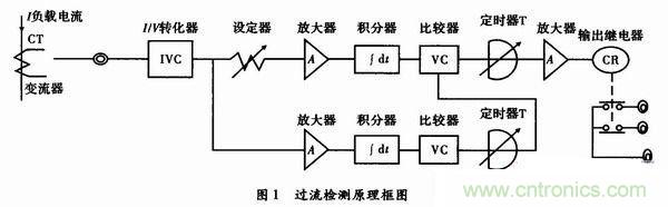 過流檢測傳感器的工作原理如圖1所示。通過變流器所獲得的變流器次級電流經(jīng)I/V轉(zhuǎn)換成電壓,該電壓直流化后,由電壓比較器與設(shè)定值相比較,若直流電壓大于設(shè)定值,則發(fā)出辨別信號。但是這種檢測傳感器一般多用于監(jiān)視感應(yīng)電源的負載電流,為此需采取如下措施。由于感應(yīng)電源啟動時,啟動電流為額定值的數(shù)倍,與啟動結(jié)束時的電流相比大得多,所以在單純監(jiān)視電流電瓶的情況下,感應(yīng)電源啟動時應(yīng)得到必要的輸出信號,必須用定時器設(shè)定禁止時間,使感應(yīng)電源啟動結(jié)束前不輸出不必要的信號,定時結(jié)束后,轉(zhuǎn)入預(yù)定的監(jiān)視狀態(tài)。