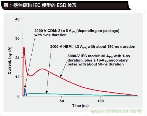 2、另一個差異存在于電壓尖峰上升時間。HBM 的規(guī)定上升時間為 25ns。IEC 模型脈沖上升時間小于 1ns,其在最初3ns 消耗掉大部分能量。如果 HBM 額定的器件需 25ns 來做出響應(yīng),則在其保護(hù)電路激活以前器件就已被損壞。