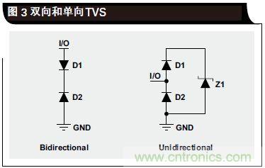 立即沿這條通路接地。在單向 TVS 情況下,只要 D2 和Z1 都不進(jìn)入其擊穿區(qū)域,則電壓信號會在接地電壓以上擺動。當(dāng)正ESD電擊擊中I/O線路時,D1變?yōu)檎蚱?,而Z1 先于 D2 進(jìn)入其擊穿區(qū)域;通過 D1 和 Z1 形成一條接地通路,從而讓 ESD 能量得到耗散。當(dāng)發(fā)生負(fù)ESD 事件時,D2 變?yōu)檎蚱?,ESD能量通過 D2接地通路得到耗散。由于 D1 和 D2 尺寸可以更小、寄生電容更少,單向二極管可用于許多高速應(yīng)用;D1 和 D2 可以“隱藏”更大的齊納二極管 Z1(大尺寸的原因是處理擊穿區(qū)域更多的電流)。