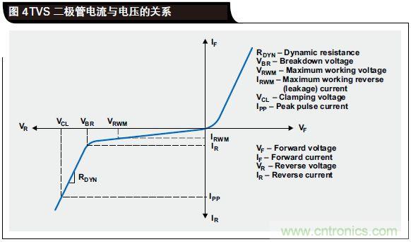 圖 4 顯示了 TVS 二極管電流與電壓特性的對比情況。盡管 TVS 是一種簡單的結(jié)構(gòu),但是在系統(tǒng)級 ESD 保護(hù)設(shè)計(jì)過程中仍然需要注意幾個重要的參數(shù)。這些參數(shù)包括擊穿電壓 VBR、動態(tài)電阻 RDYN、鉗位電壓 VCL 和電容。