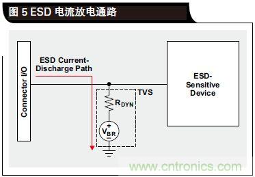 ESD 是一種極速事件,也就是幾納秒的事情。在如此短的時間內(nèi),TVS 傳導(dǎo)接地通路不會立即建立起來,并且在通路中存在一定的電阻。這種電阻被稱作動態(tài)電阻(RDYN),如圖 5 所示。