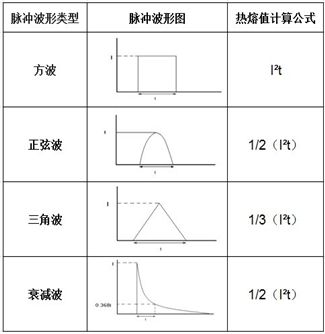 表2是幾種常見脈沖波形的計算公式。脈沖電流的熱熔值可以通過對脈沖電流波形數(shù)據(jù)的積分計算得到。