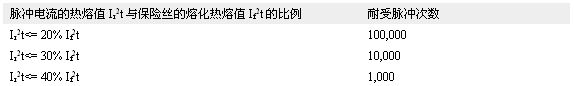 由于脈沖電流通過保險絲的時候,會產(chǎn)生熱量,所以雖然單次脈沖的能量不足以使保險絲熔斷,但多次脈沖沖擊會導(dǎo)致保險絲熔斷。為了保證保險絲可以耐受規(guī)定次數(shù)的脈沖電流,需要依據(jù)表3中所示的脈沖折減系數(shù)計算保險絲的I2t規(guī)格。如果脈沖發(fā)生時,保險絲所處環(huán)境溫度高于室溫(+25°C),須做相應(yīng)的溫度折減。