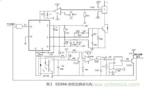 如圖2所示,用外接8V穩(wěn)壓管Vw1代替驅動芯片內部的穩(wěn)壓管Vz2,在穩(wěn)壓管兩端并聯(lián)了兩個電容值分別為105μf和0.33μf的去耦濾波電容。為防止柵極驅動電路出現(xiàn)高壓尖峰,在柵射極間并聯(lián)了反向串聯(lián)的16V(V02)和8V(V03)穩(wěn)壓二極管。為了改善控制脈沖的前后沿陡度和防止震蕩,減小IGBT 集電極的電壓尖脈沖,需要在柵極串聯(lián)電阻Rg。柵極串連電阻Rg要恰當,Rg過小,關斷時間過短,關斷時產(chǎn)生的集電極尖峰電壓過高;Rg過大,器件的開關速度降低,開關損耗增大。優(yōu)化電路采用了不對稱的開啟和關斷方法。在IGBT開通時,EXB841的3腳提供+16V的電壓,電阻Rg2經(jīng)二極管Vd1和Rg1并聯(lián)使Rg值較小。關斷時,EXB841內部的V5導通,3腳電平為0,優(yōu)化驅動電路在IGBT的E極提供-8V電壓,使二極管V01截止,Rg= Rg1具有較大值。并在柵射極間并聯(lián)大電阻,防止器件誤導通。