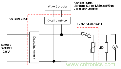 2Pro AC 器件一個常見的應用是 LED 照明,其雷擊的保護要求都小于 2kV surge,2Pro AC 正好可以防護 2kV 的雷擊。下圖是不久前網友調試的一塊客戶 LED 電路板示意圖,雷擊要求是 2kV,把 2Pro AC 放置于 LED lighting 電路輸入端,再加上雷擊波形發(fā)生器和交流耦合。