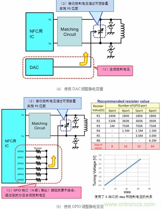第二, 如圖2(b)所示,從NFC用IC等GPIO端口生成控制電壓來調(diào)整靜電容量。GPIO是General Purpose Input/Output的簡稱,是IC芯片提供的輸出端子的一種。特定用途和信號尚未明確,但可以根據(jù)軟件指令進(jìn)行任意的輸出變化。比如說,軟件指示為輸入“0”的話則為0V,指示為輸入“1”的話則有可能會執(zhí)行輸出3V的操作。如果利用GPIO的輸出端子的話,如果收到的是0V、3V這兩個值的輸出信號,那么執(zhí)行的操作就是通過2n的電子元件的組合來實現(xiàn)合成2n的阻抗電壓。