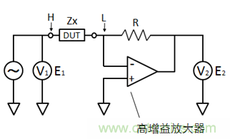 DUT為Device Under Test的縮寫,指測(cè)量對(duì)象。高增益放大器會(huì)自動(dòng)調(diào)整增益,使通過電阻R的電流與通過DUT的電流相等,DUT 的低電位側(cè)(圖中L一側(cè))一直處于虛擬接地(電位=0)狀態(tài)。此時(shí)的輸入電壓E1及輸出電壓E2能測(cè)出相位角,如下所示。