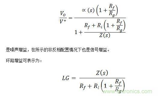 這對于理想的CFB[Ri=0]來說,是一個非常重要的公式,因為它表明了環(huán)路增益與反饋電阻的比例關系,因此反饋電阻可作為CFB的主要補償。事實上,增加反饋電阻及帶寬(BW),不僅會降低反饋電阻,同時還可增大帶寬。實際上,不可能將反饋電阻降低到特定值以下,否則放大器會發(fā)生振蕩。