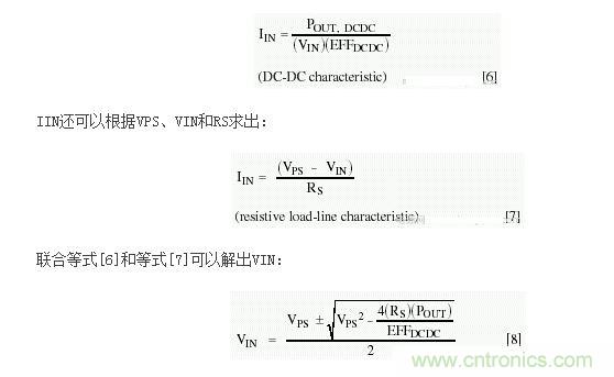 從該方程很容易得到能量損耗,并且圖3分析曲線中的有關(guān)參數(shù)也可以從中得到。舉例來說,如果串聯(lián)電阻(RS)等于零,電阻負(fù)載線的斜率將會(huì)變?yōu)闊o窮大。那么負(fù)載線就成為一條通過VPS的垂直線。在此情況下,VIN+ = VPS,效率為100%。隨著RS從0Ω增加,負(fù)載線繼續(xù)通過VPS,但越來越向左側(cè)傾斜。同時(shí),VIN+和VIN-匯聚于VPS/2,這也是50%效率點(diǎn)。當(dāng)負(fù)載線相切于I-V曲線時(shí),方程[8]只有一個(gè)解。對于更大的RS,方程沒有實(shí)數(shù)解,DC-DC轉(zhuǎn)換器將無法正常工作。
