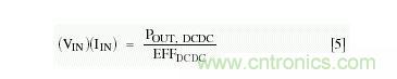 現(xiàn)在,我們有了足夠的信息來計(jì)算電源自身的耗散功率及其效率。因?yàn)殡娫措妷旱拈_路值(VPS)已經(jīng)給出,我們僅需找出DC-DC轉(zhuǎn)換器的輸入電壓(VIN)。從等式[5]解出IIN: